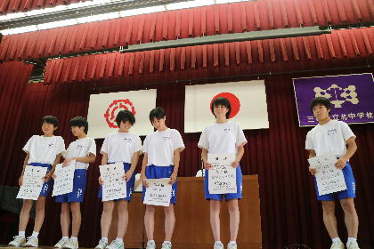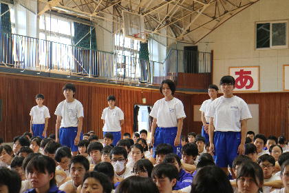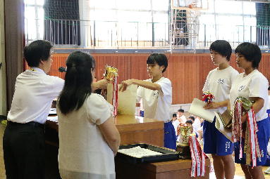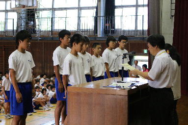学総大会を初めとする各運動部の大会や青少年の主張大会、漢字検定合格者、硬筆展、漢字検定などの賞状を生徒全員に披露し、校長先生に表彰していただきました。