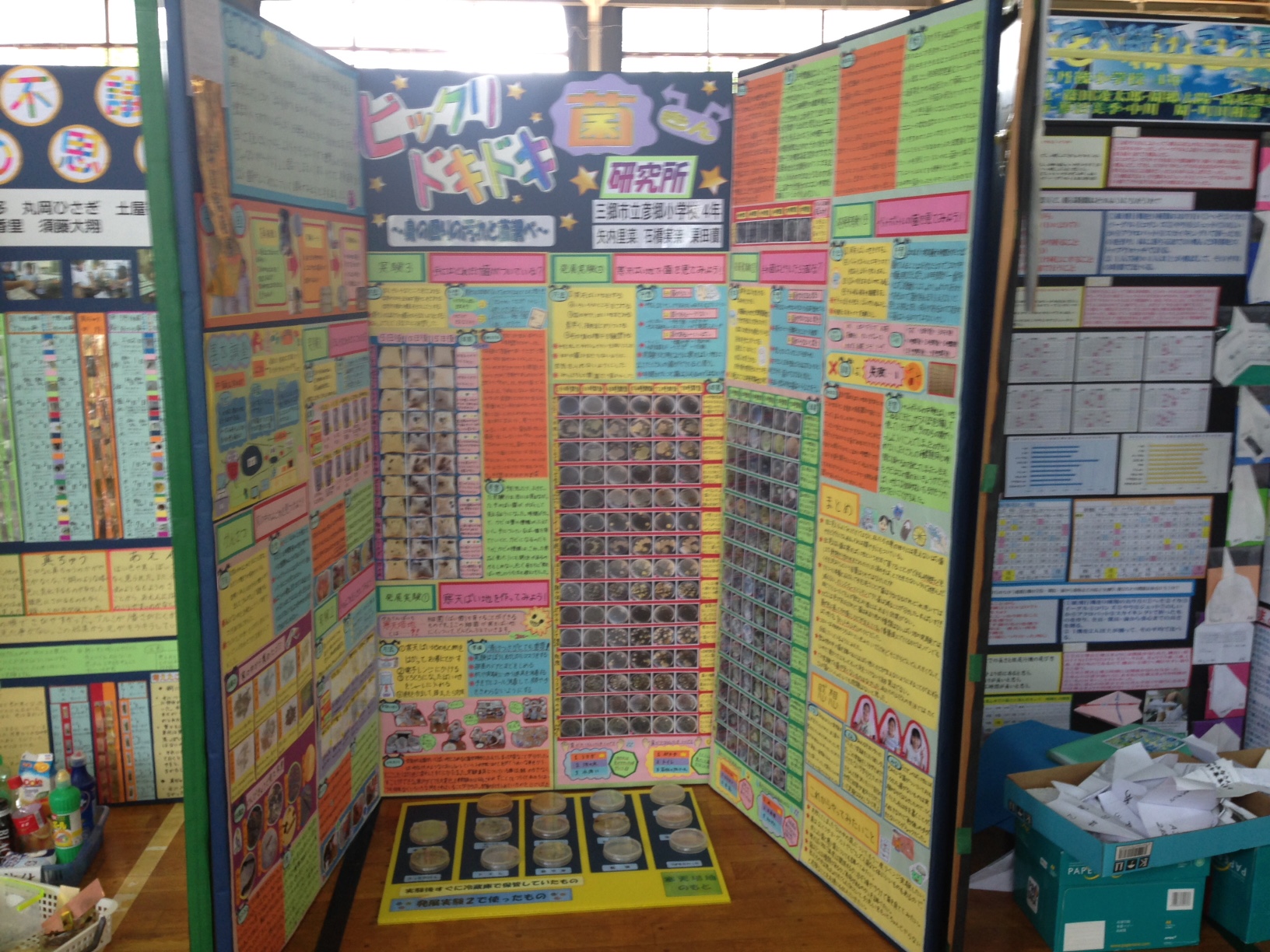 市内科学展にて、本校4年生児童3名のパネル作品が埼葛推薦賞を受賞いたしました。 題は「ビックリドキドキ 菌研究所 ~身の回りの汚れと菌~」です。 ドアノブ、トイレ、砂場などの普段生活している環境にどれだけ菌がいるのかを、 菌を培養して、調査をしました。