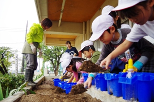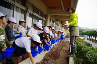 2年生が、校務の阿部さんの教えてもらいながら球根を鉢に植えていました。