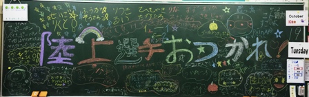 陸上大会の後、学校の黒板にはこんな書き込みがありました。 仲間をしっかりと応援できるのはいいですね。 素敵な仲間達!
