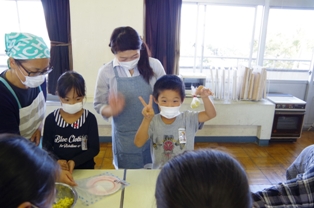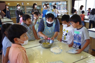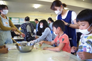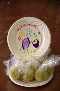 保護者の方々が調理してくださったサツマイモを、児童達が教えてもらいながらこねこねとまるく形作りました。