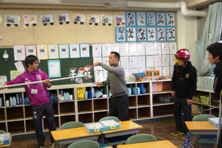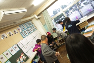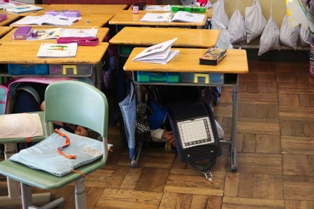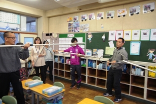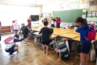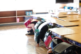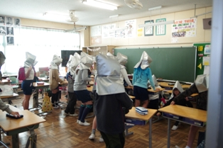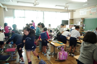 午前中には以前に越谷でも発生した竜巻を想定して、避難の仕方を訓練しました。 竜巻は突然発生すると同時に、周囲のものを巻き込んで移動していきます。 その際に、割れたガラスや瓦なども取り込むので、大変危険です。 避難は、最初に机を教室の端に寄せてシェルターを作ります。 その後、ランドセルなどで頭部や背中を保護しながらみんなでシェルターの中に入り込み避難します。 竜巻が来た際は、 1)窓を閉める 2)カーテンを閉める 3)窓からはなれる 4)頭部、首を保護する(ランドセルなどのカバンや厚手の本、クッションなど) 5)机などをシェルターとして避難する。 このことを覚えておきましょう。
