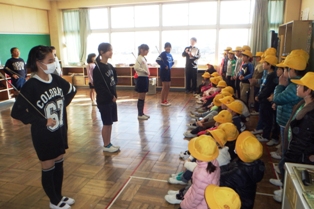 今日は彦糸中学校のお兄さんお姉さんが来校して一緒にあいさつをしてくれました。