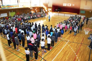 集会では音楽の田中教諭の指揮の下、みんなで「ともだちだから」を歌いました。