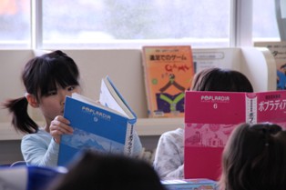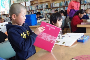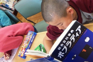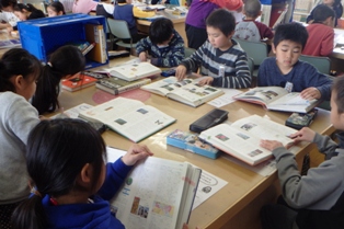3年生の児童が図書館で熱心に何かを読んでいました。