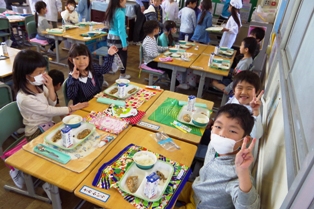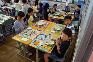 最初はおにぎりやパン等の簡易給食だった1年生も、日に日にメニューが増えてきて、だんだんお兄さんお姉さんと同じになってきています。 自分たちで配膳したり片付けも始めたりしています。