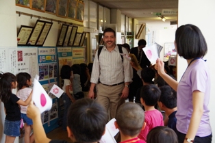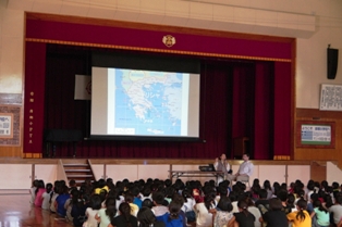 今日はギリシャ大使館の方々が来校され、児童や職員にギリシャの事を教えて下さる講演会が行われました。