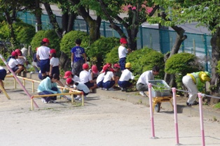 朝の時間に、学校の校庭の回りや体育館横、学校回りの除草作業を行いました。 日差しも強くなり、雨が降るとすぐに草が生えてしまうため、様々な場所で草が茂っていました。 児童達は、学年やクラスごとに分担された場所の草を一斉に抜いていました。 おかげで綺麗になりました。有り難うございます。 また手伝いに来て下さったPTAの皆様、暑い中どうも有り難うございました。