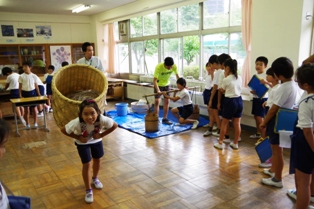 4年生が歴史と民俗の博物館の出前授業を受けていました。 今回は「昔の道具」として持ってきていただいたものを実際に触っていました。 今ではほとんど使うことのない石臼や籠をとっても楽しそうに使っていましたね。