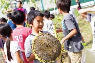 3年生が、咲き終わったひまわりから種を取るために畑の片付けをしていました。