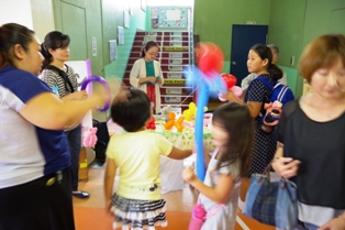 バルーンアートを行ってくださいました金子様の場所に集まった児童は、色々な形に変わる様子に大興奮でした。