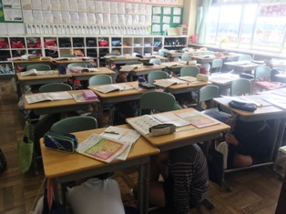 音の正体は児童や教員が机の下に避難しているときのものです。