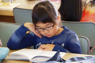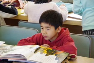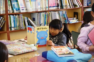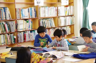 2年生が図書室で読書中でした。 各自、好きな本を選んで読んでいました。 中には、となりの友達と呼んでいる児童達も。 とても微笑ましい光景でした。