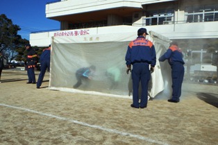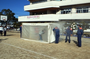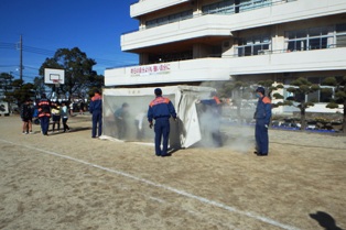 本日は避難訓練がありました。 近場で地震がありアラートがなったのは記憶に新しいですね さて本日は、地震が発生して家庭科室から出火したという状況を想定して行いました。 避難の際には、口元を押さえたり出火場所を避けたルートを選び避難しましたね。 また、職員室でも消防職員立ち会いの下で通報を行うなど実際さながらの動きでした。 訓練後に6年生は「煙体験」を行いました。 火災の際に発生する煙、これは吸い込むと人体に悪影響を及ぼします。 重度の場合は命の危険があります。 そのため、煙を避けるように「低い姿勢」で「口元をハンカチやタオル、衣類で押さえる」のが大切だと学びました。 体験では内部が仕切られたテントを煙で満たし、その中を通過しましたね。 ※内部はこのように前の人が見えるくらいです。 今日学んだことはしっかりと覚えておいて、もしもの時に生かせるようにしたいですね。