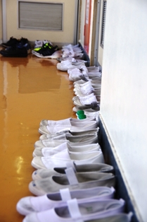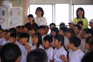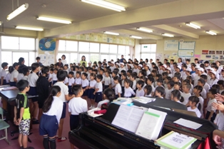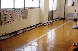 音楽室で練習している児童達は上履きを廊下に並べています。