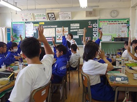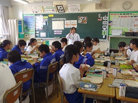 今日は、三郷市教育委員会学務課学校給食係の石井亜希子先生に来校していただき、1年1組で食育指導をしていただきました。先生からは、おぼんにのせるときのご飯や汁物、主菜、副菜の位置など、日本人としてしっかりと理解していなければならない食の文化や子どもたちの成長に合わせてつくられている学校給食について、たいへんわかりやすく教えていただきました。これから、全クラスで食育指導を実施する予定ですので、石井先生からしっかりと学んでほしいです。