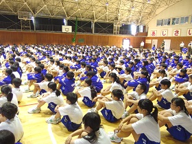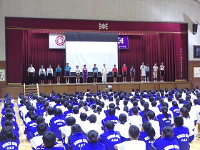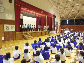 昨日、授業が終わった後、全校生徒が体育館に集まり、生徒会が中心となって集会を行いました。各部の部長からは、銅賞を金賞へ、準優勝を優勝へ、○○中に前回負けたリベンジを果たして県大会へなど強い決意表明があり、大会にかける部長たちのあつい思いが伝わってきました。