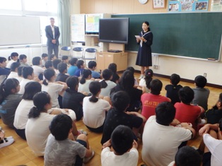 今日は彦糸中学校の生徒会長が来校して、6年生を対象に「中学校へ向けて」の話をしてくれました。