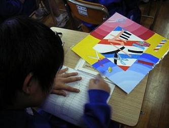 1年生の美術の授業で 「文字とフレームのデザイン」の鑑賞をしています。