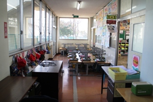写真は教室の床にワックスをかけるため、廊下に室内の物品をすべて出しているところです。
