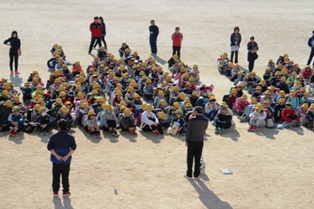 普段は学年ごとに別々に下校していますが、今日はみんなでそろっての下校です。