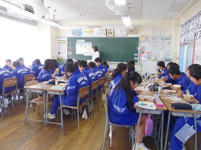 17日(木)今日は2年4組の食育指導です。白石先生から牛乳の大切さについて話していただきました。冬休み中に毎日牛乳を飲んでいた生徒は、4組で2人だけでした。骨を増やすのは10代までというお話もありました。中学生時代の食生活は重要です。どのクラスもとても静かな給食の時間でした。