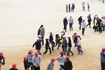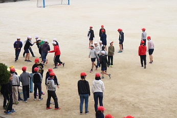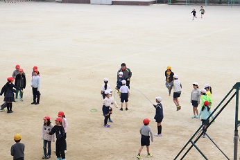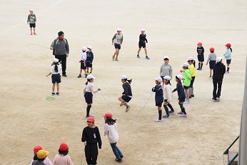 各クラスが大繩の練習をしていて、それぞれのベスト記録を出すために真剣に取り組んでいます。