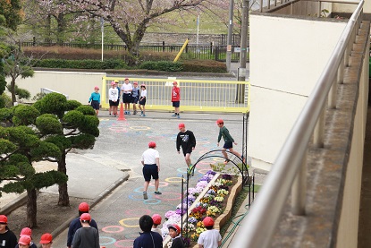 ボランティアの方々が綺麗に塗ってくれた〇を生かして「けんけんぱ」を行っていました。