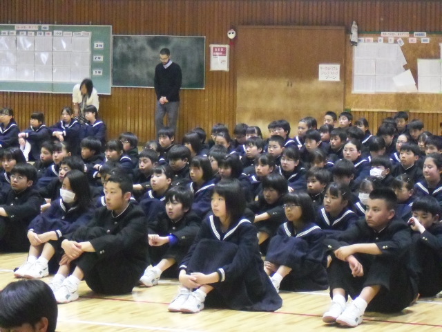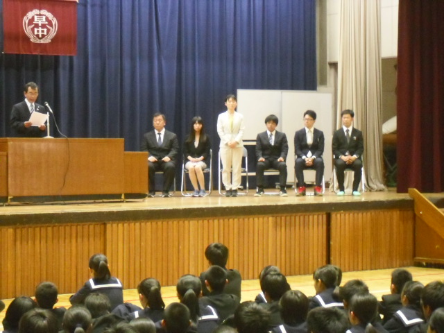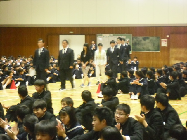 本日6校時「離任式」を行いました。お忙しい中6名の先生方にご来校いただきました。お世話になった懐かしい先生との再会に生徒たちも喜んでいました。