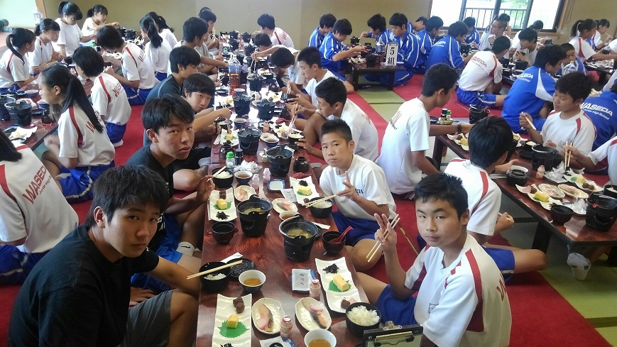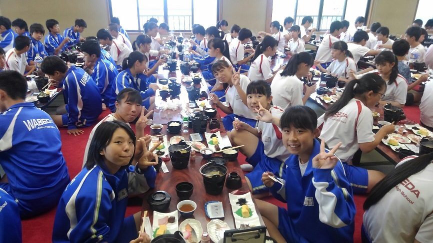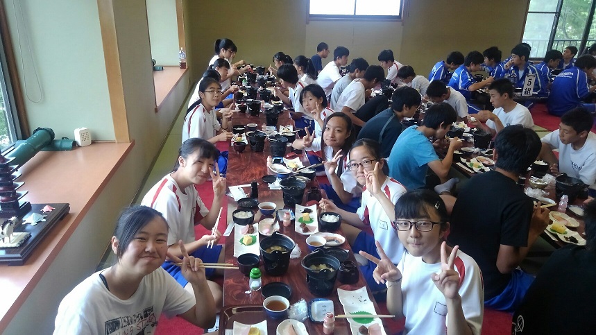 修学旅行2日目です。朝食の様子です。がっつり食べて今日一日に備えます。