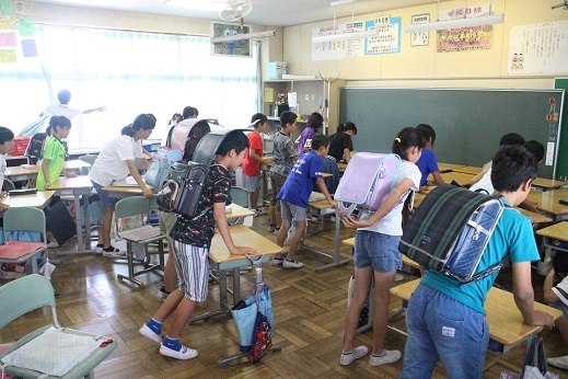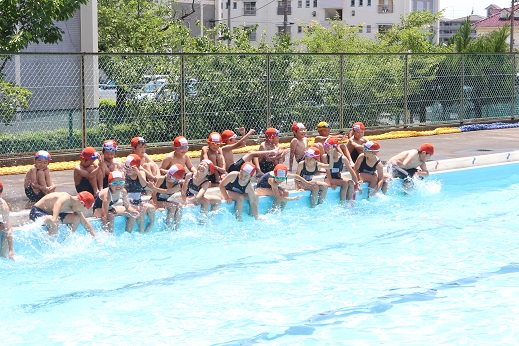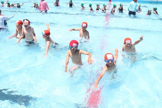 2年生が1年生のお手本として、体の洗い方や水慣れなどをしっかりとみせてくれました。