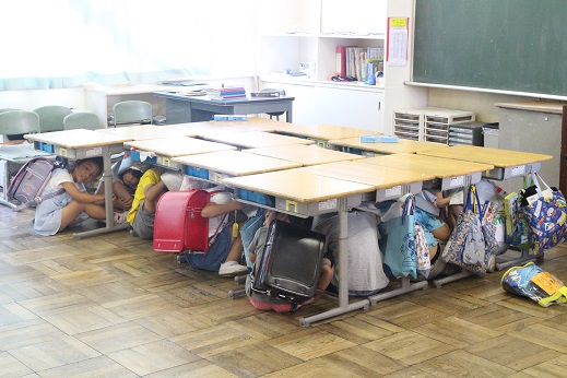 それにそなえて、机でシェルターを作りその下にもぐることを指導しています。