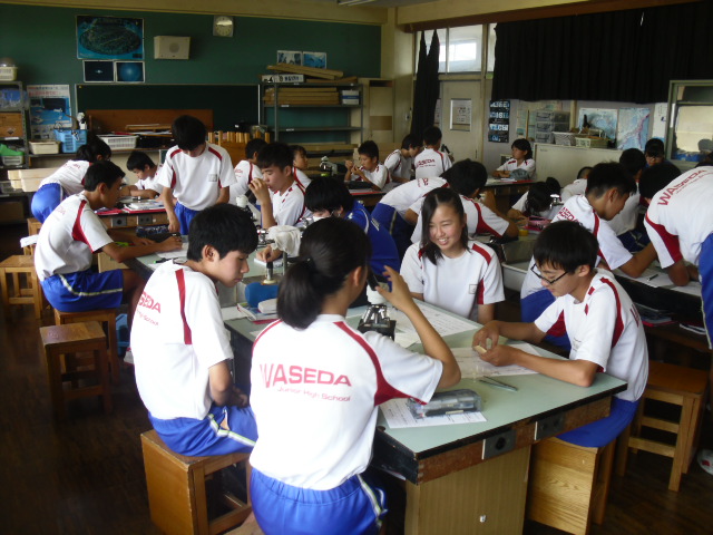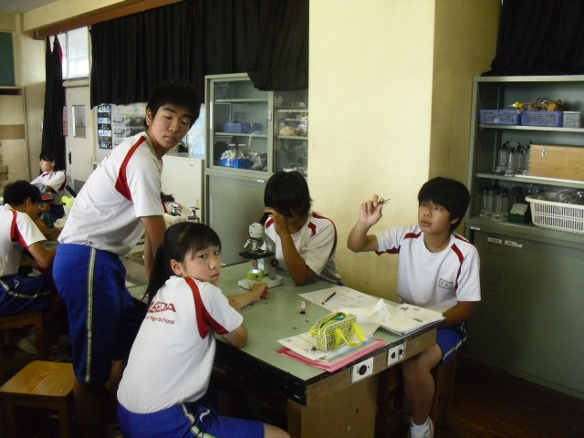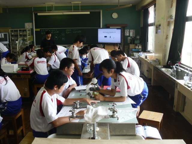 理科室で顕微鏡を使った授業をしていました。