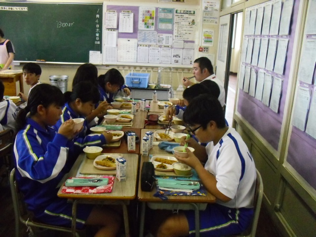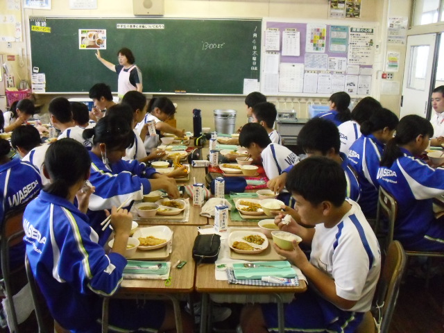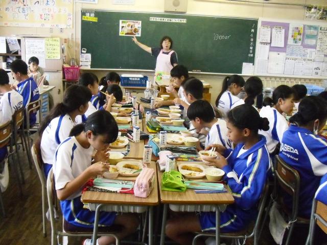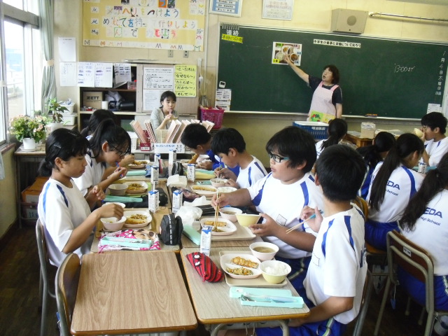 現在昼食時、学校栄養教諭の先生が1日1クラスを回って、食育指導をしています。