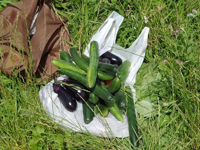 あじさい学級の生徒たちが北中ファームでキュウリとナスの収穫と除草作業を行いました。少しずつたくさんの野菜が収穫できるようになってきました。