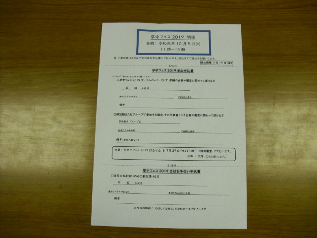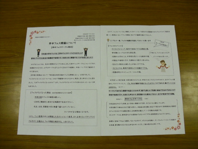 昨日配布の「理事会だより」に記載がありました通り、早中フェスサークルのプリントを本日配布しましたので、ご確認お願いします。