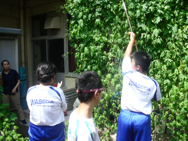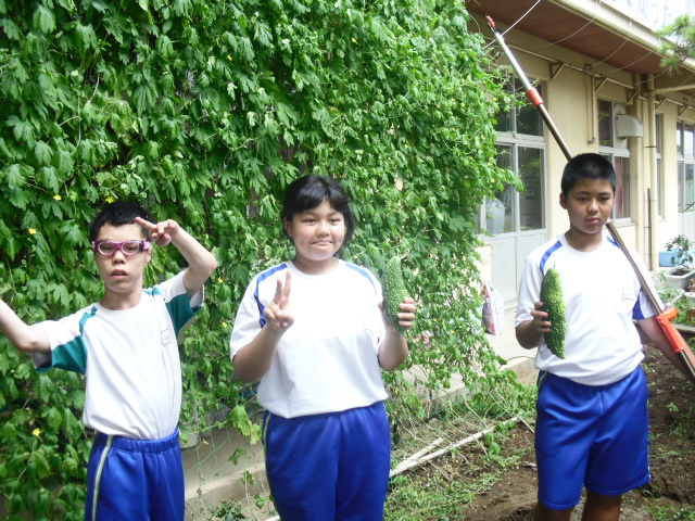 7組・8組では、春から大事に育てているゴーヤの収穫を行いました。たくさん収穫できました。まだまだ収穫できます。
