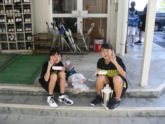 本校会場のバスケット部、遅めの昼食をとっていました。