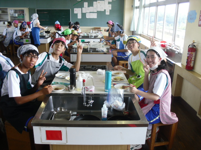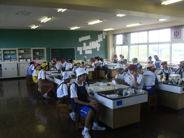 調理実習でした。調理を終えて食事中でした。