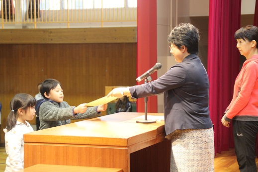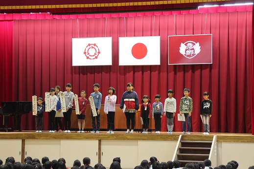 全校朝礼では、様々な分野で活躍した児童たちの表彰が行われました。
