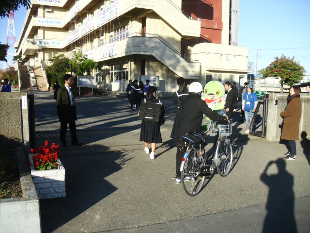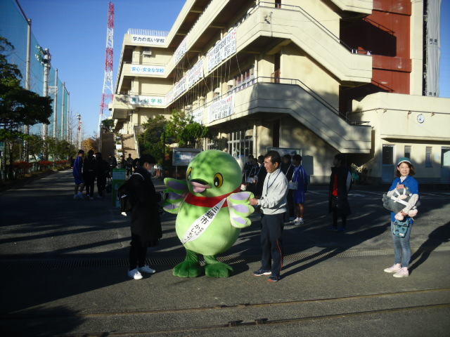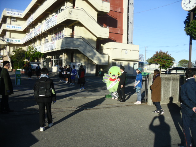 本日、朝のあいさつ運動に「カイちゃん」が来校し一緒にあいさつ運動に参加してくれました。登校する生徒たちも喜んでいました。