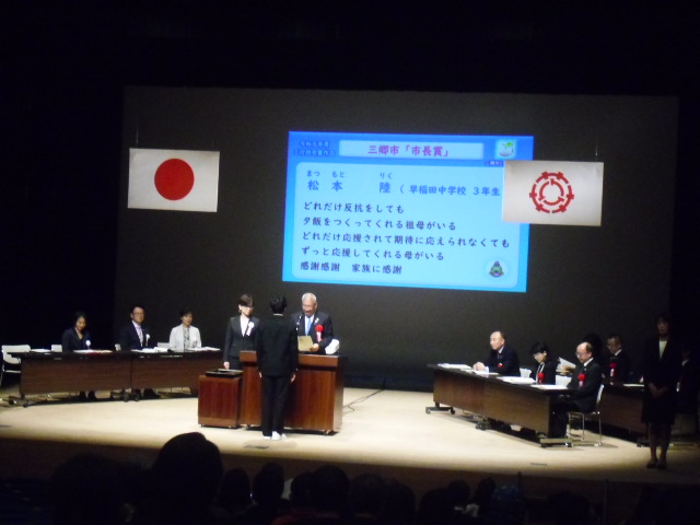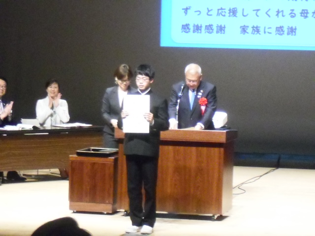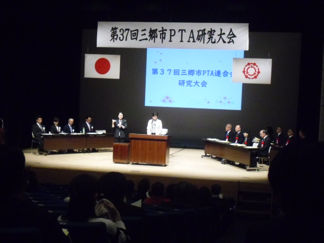 本日、文化会館において第37回三郷市PTA連合会研究大会が行われました。研究大会の前には三行詩の授賞式が行われ、松本陸さんが「市長賞」を受賞し、三郷市長様より賞状授与がありました。