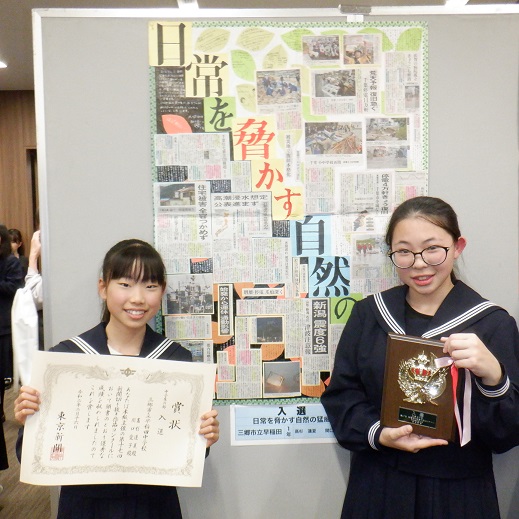 昨日(2/16日)、東京都の品川フロントビルにおいて「第17回新聞切り抜き作品コンクール」の表彰式が行われました。入選に高杉蓮夏(1年)さん・関口愛子(1年)さん と 横尾咲姫(2年)さん・関田いちか(2年)さん・田中言葉(2年)さんが選ばれ表彰されました。また、佳作に伊殿レナ(1年)さん・吉田美広(1年)さん、努力賞に西田千穂(1年)さん・大井愛菜(1年)さん・秋田結愛(1年)さんが選ばれました。