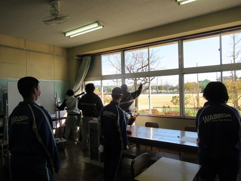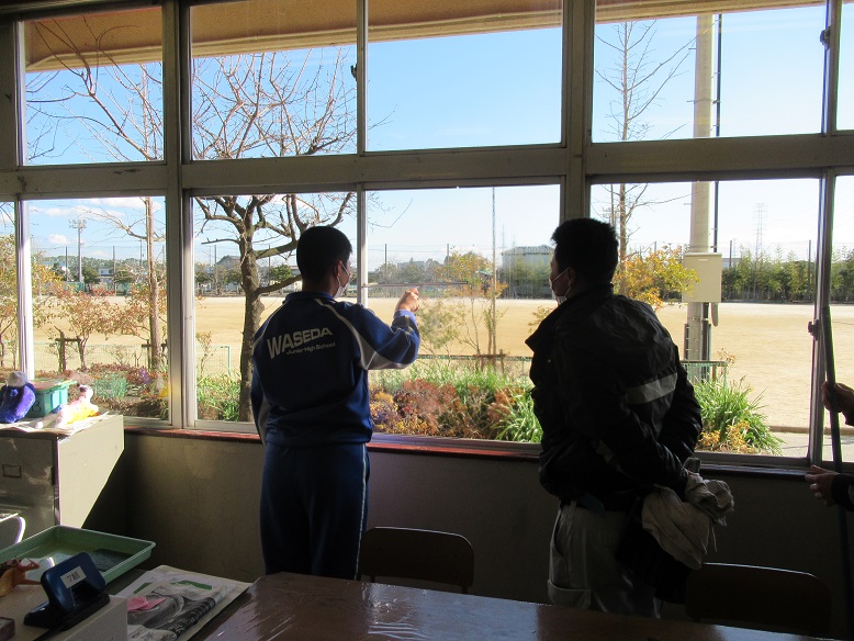 帰ってきてから学校では、業者さんが窓清掃をしていました。普段から窓清掃の練習をしているので業者さんにお願いし、見学させてもらい実際にやらせてもらいました。基本ができていると褒められました。お忙しい中ありがとうございました。
