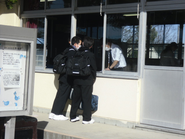 登校が集中しないようにバラバラに登校しています。元気な姿を見て安心しました。宿題が配られたり、荷物を持ち帰ったりしています。