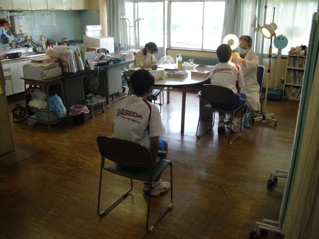廊下ではディスタンスを保ち、静かに並んで待てています。