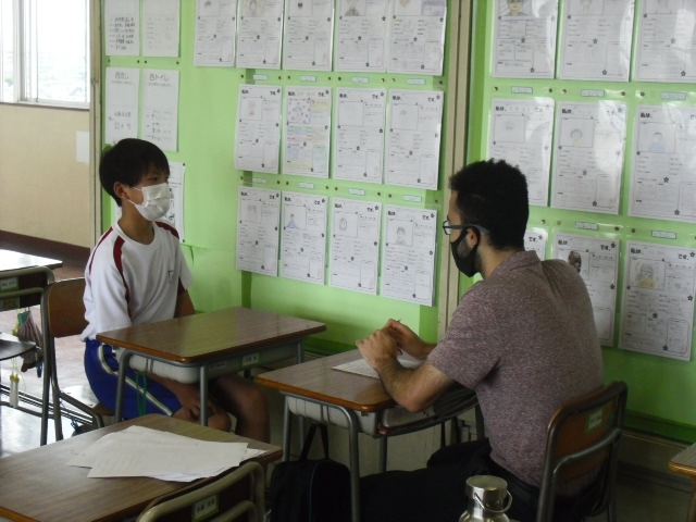 英語の授業では、個別にALTとの英会話の練習をしていました。