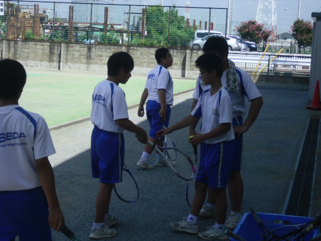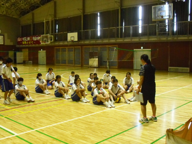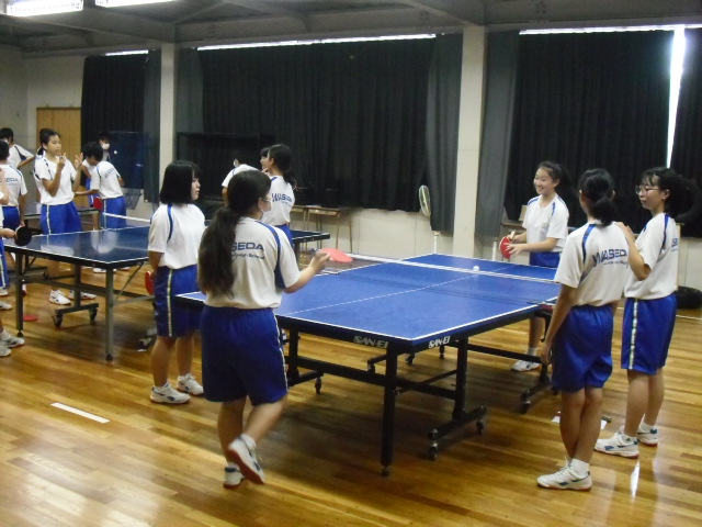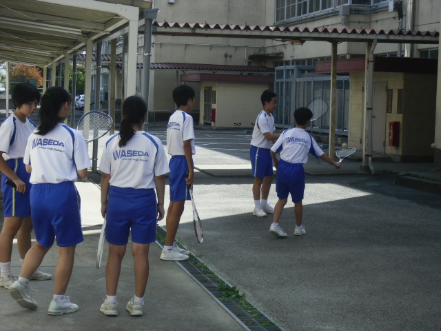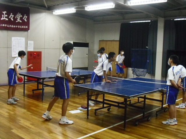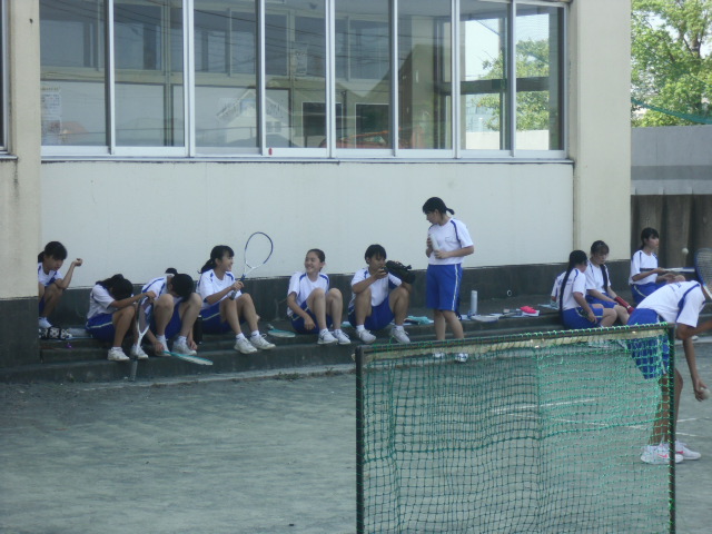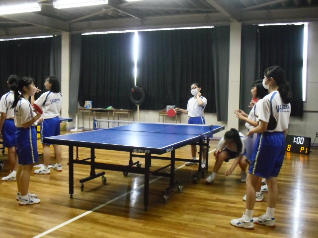 体育の授業です。テニスとバレーボールと卓球を行っていました。体育館は換気して冷房が入っていますが、外は暑いので、こまめに休憩と水分補給を繰り返していました。