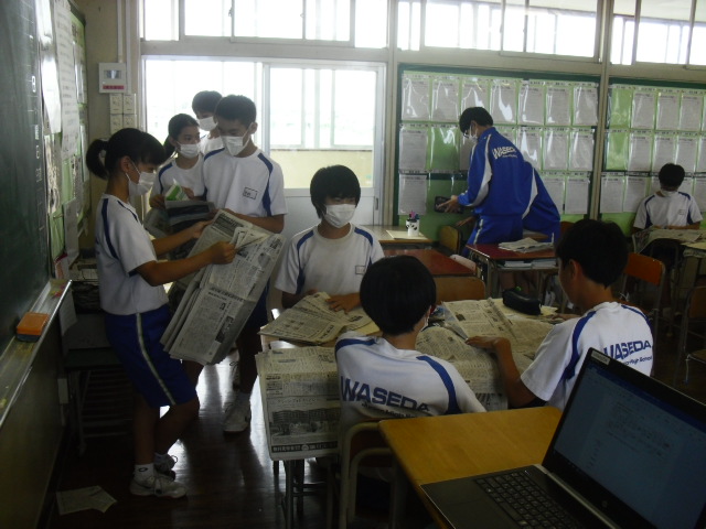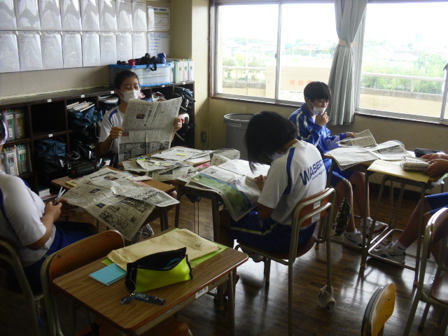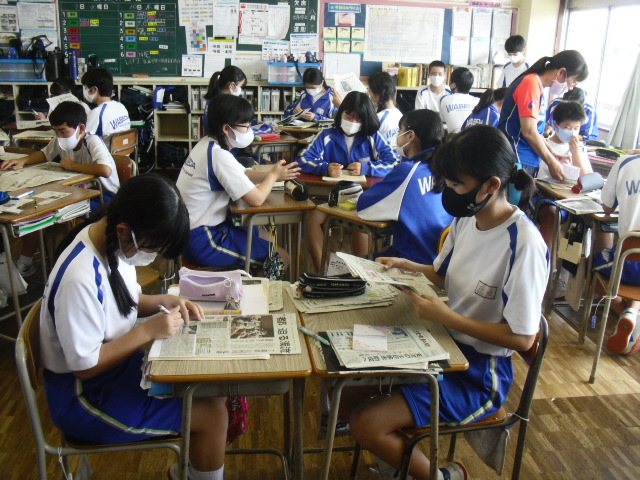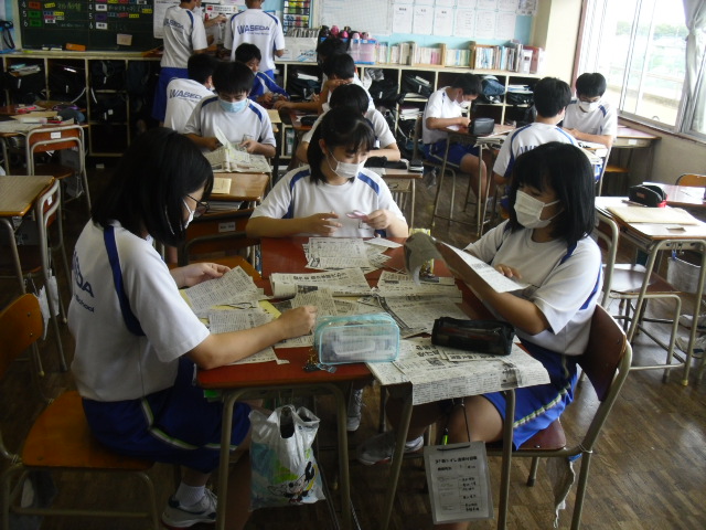 6校時、2年生の総合の時間です。新聞を利用した授業を行っています。