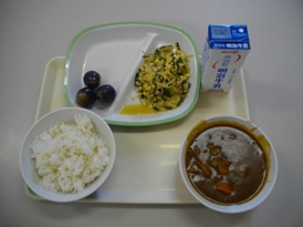 ○ハヤシライス ○ゴーヤチャンプルー ○牛乳 ○巨峰3粒でした。